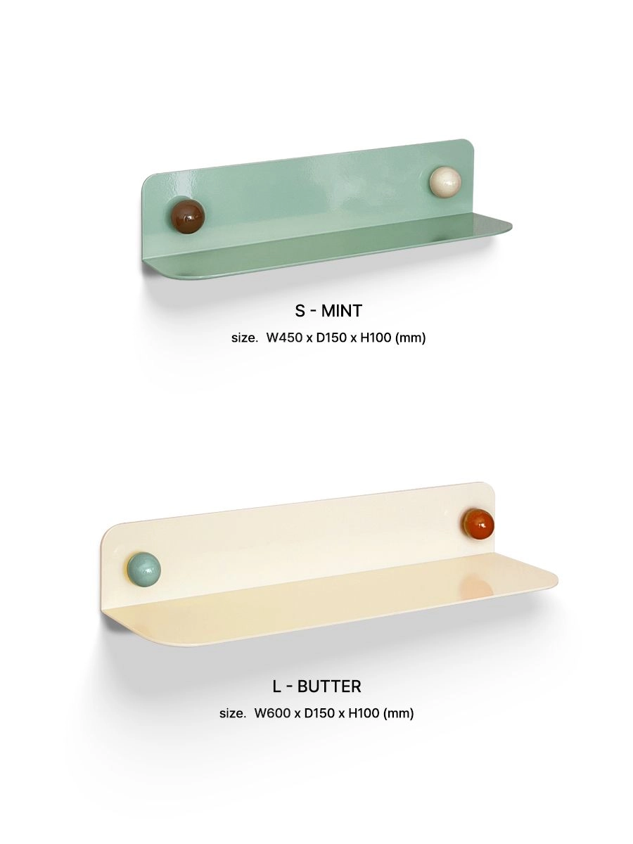 • 실용적인 사이즈의 벽선반으로 나사못으로 고정하여 책이나 인테리어 소품을 올려놓아 사용 가능하며, 컬러드랍 특유의 컬러조합이 심심한 공간에 선물 같은 포인트가 되어줍니다.