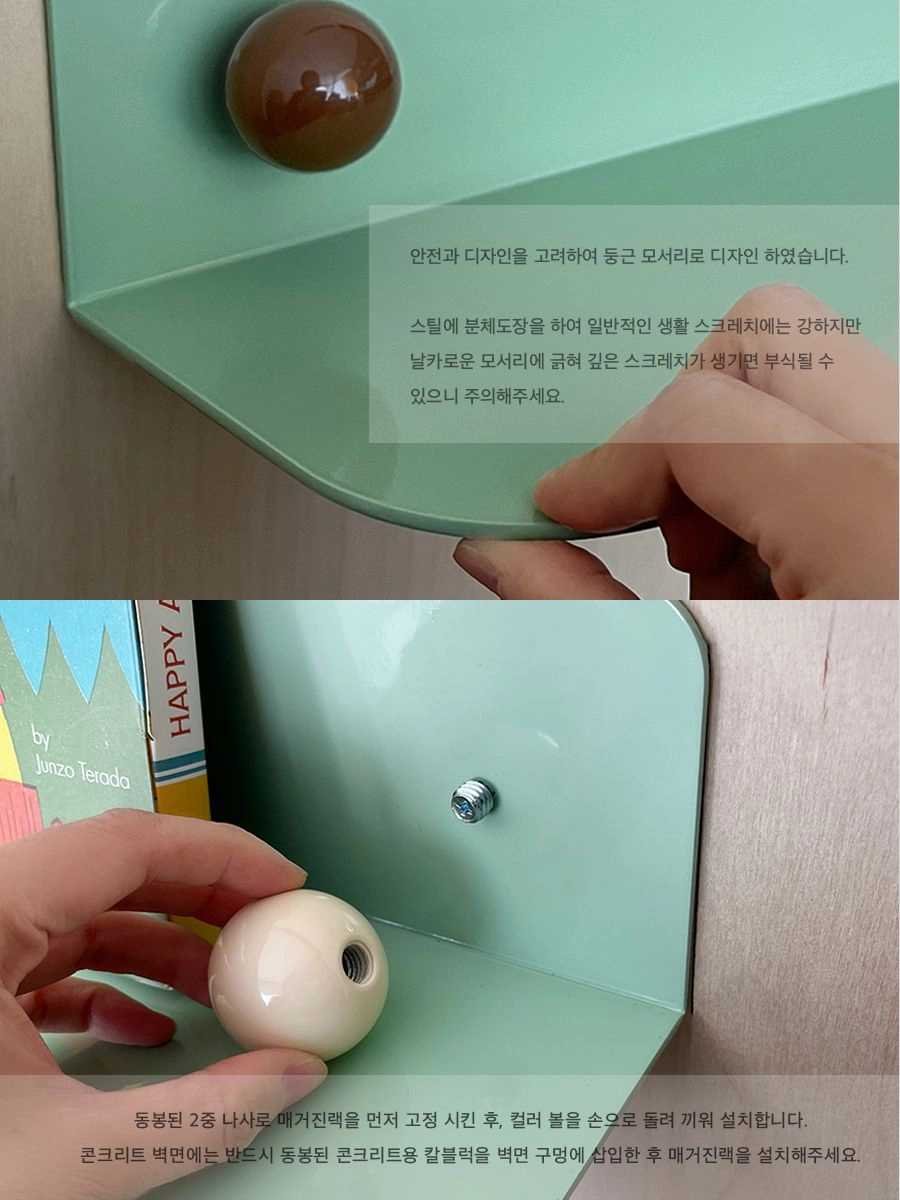 • 동봉된 2중 나사로 월셸프를 먼저 고정 시킨 후, 컬러볼을 손으로 돌려 끼워 설치합니다.