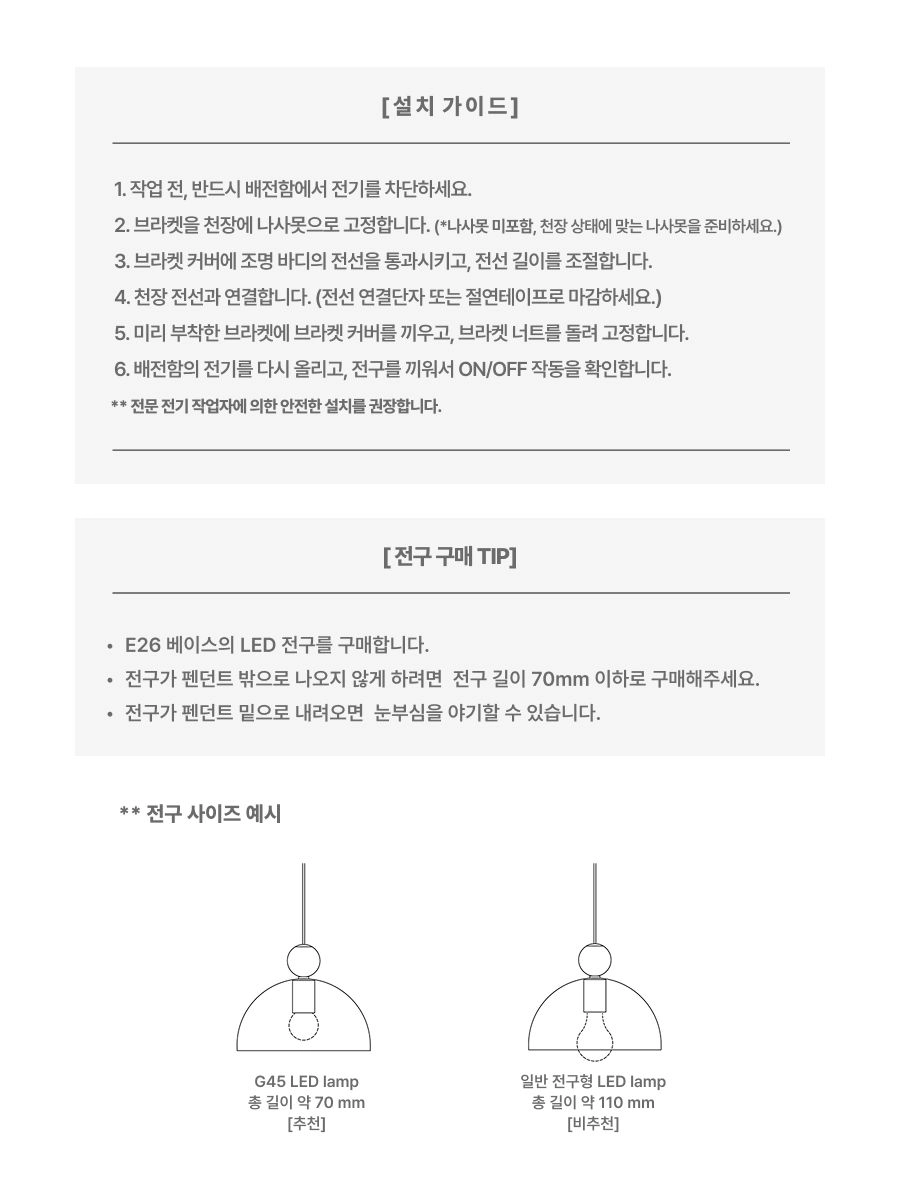 [ Composition ] 펜던트 조명 1개(E26 베이스), 4W G45 LED 전구 1개, 브라켓 & 브라켓 커버 1세트