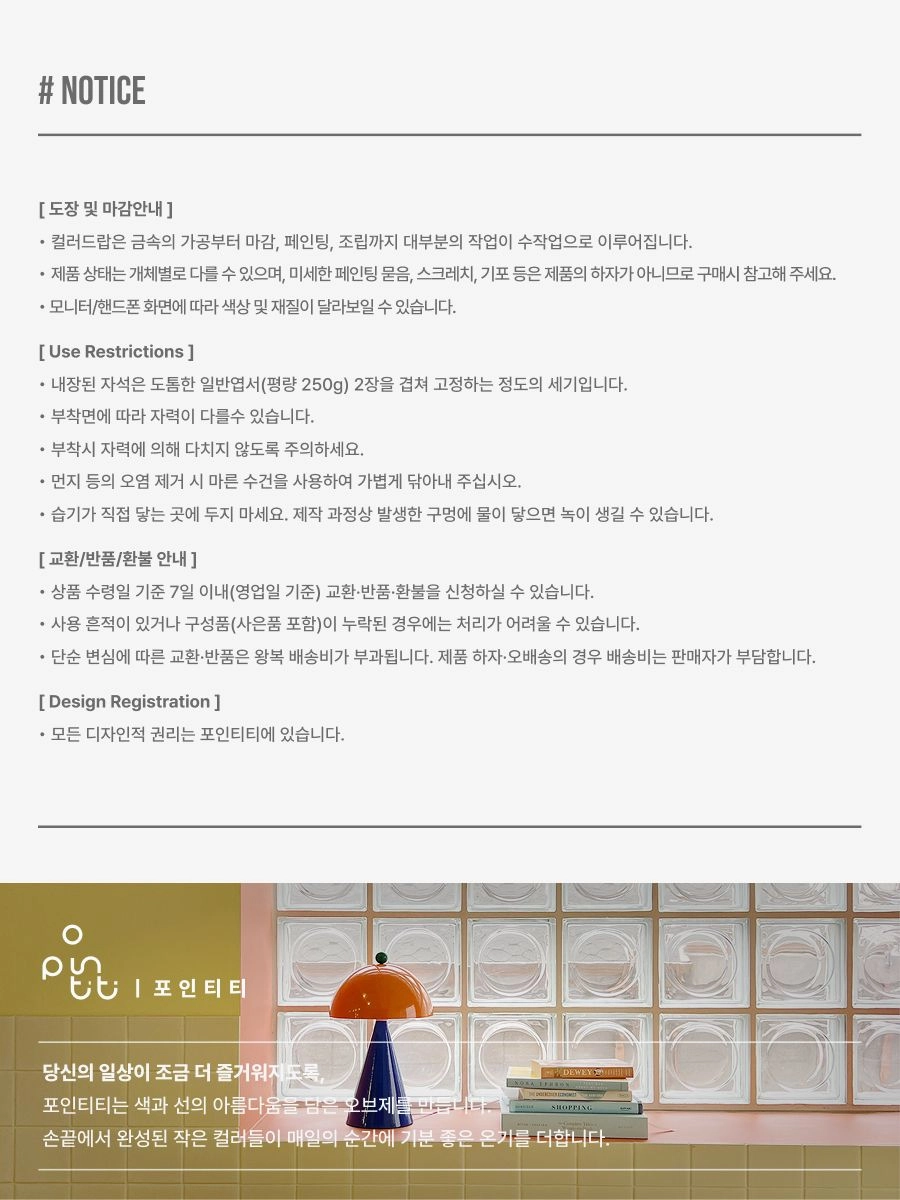 • 제품마다 약간씩 상태가 다를 수 있으며, 미세한 페인팅 묻음, 스크레치, 기포 등은 제품의 하자가 아니므로 구매시 참고해 주세요.
